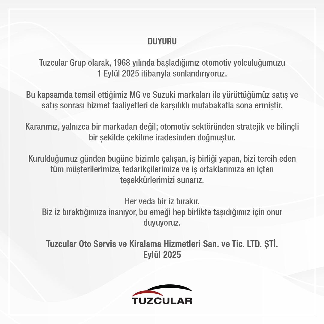 Tuzcular Oto, 2020 yılında MG ve Suzuki markalarının yetkili bayisi olarak Edirne’de hizmet vermeye başlamıştır. Tuzcular Grup bünyesinde faaliyet gösteren Tuzcular Oto, iki global otomotiv devini aynı çatı altında birleştirerek müşterilerine geniş bir ürün yelpazesi sunmaktadır. Açıldığı günden bu yana, müşteri odaklı yaklaşımı ve güçlü teknik ekibiyle Edirne ve çevre bölgelerde tercih edilen bir otomotiv bayisi haline gelmiştir.